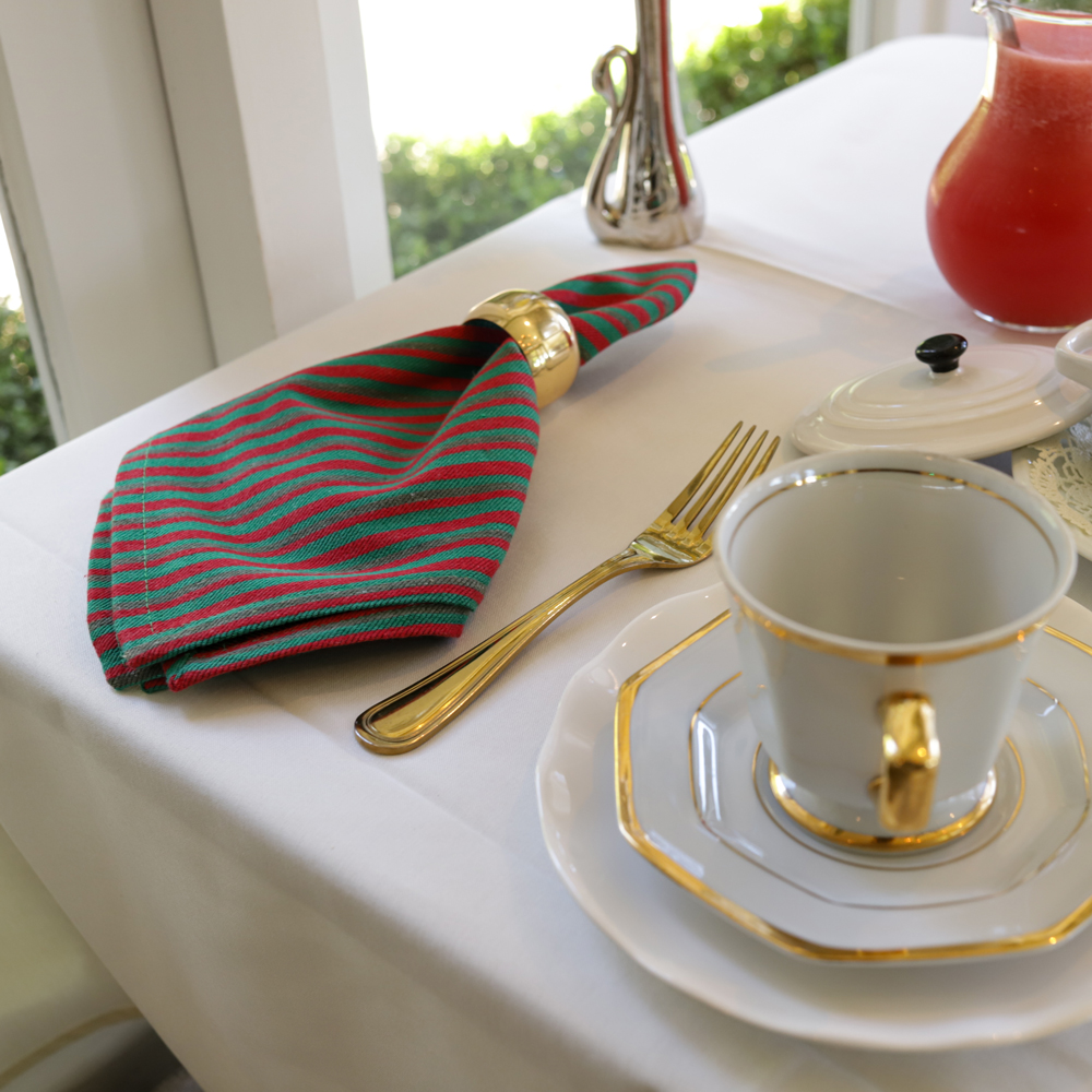 As listras vermelho e verde do Guardanapo Mary trazem um ar natalino casual chic para a mesa, equilibrando elegância e atemporalidade. Com uma textura macia, ótima absorção e alta durabilidade. Uma peça clássica, funcional e indispensável para quem ama receber bem.