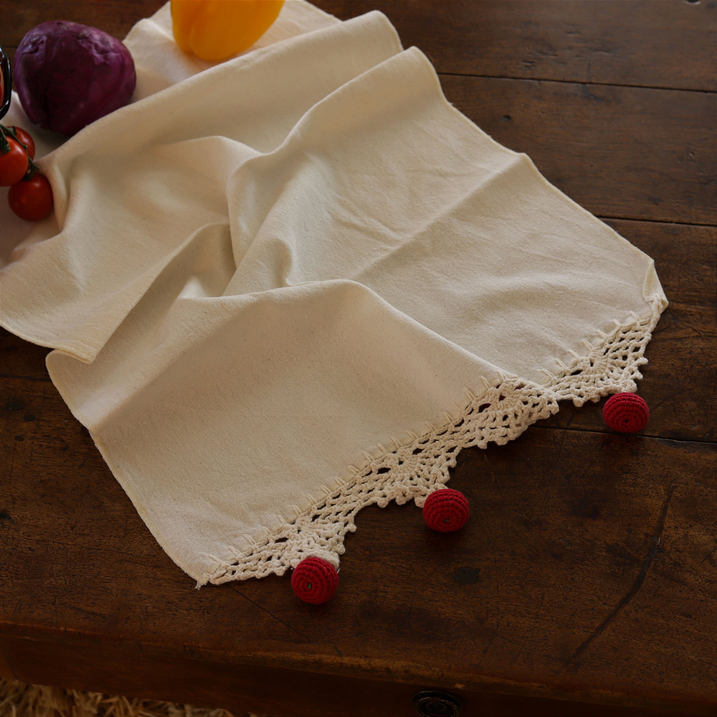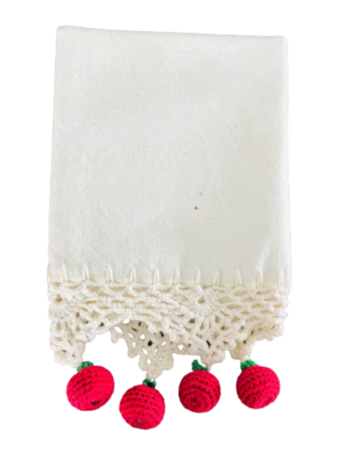 Os ornamentos em forma de cerejas, também artesanais, tornam o pano único e divertido, ideal para quem gosta de adicionar personalidade ao ambiente ou criar uma decoração mais artística na cozinha.