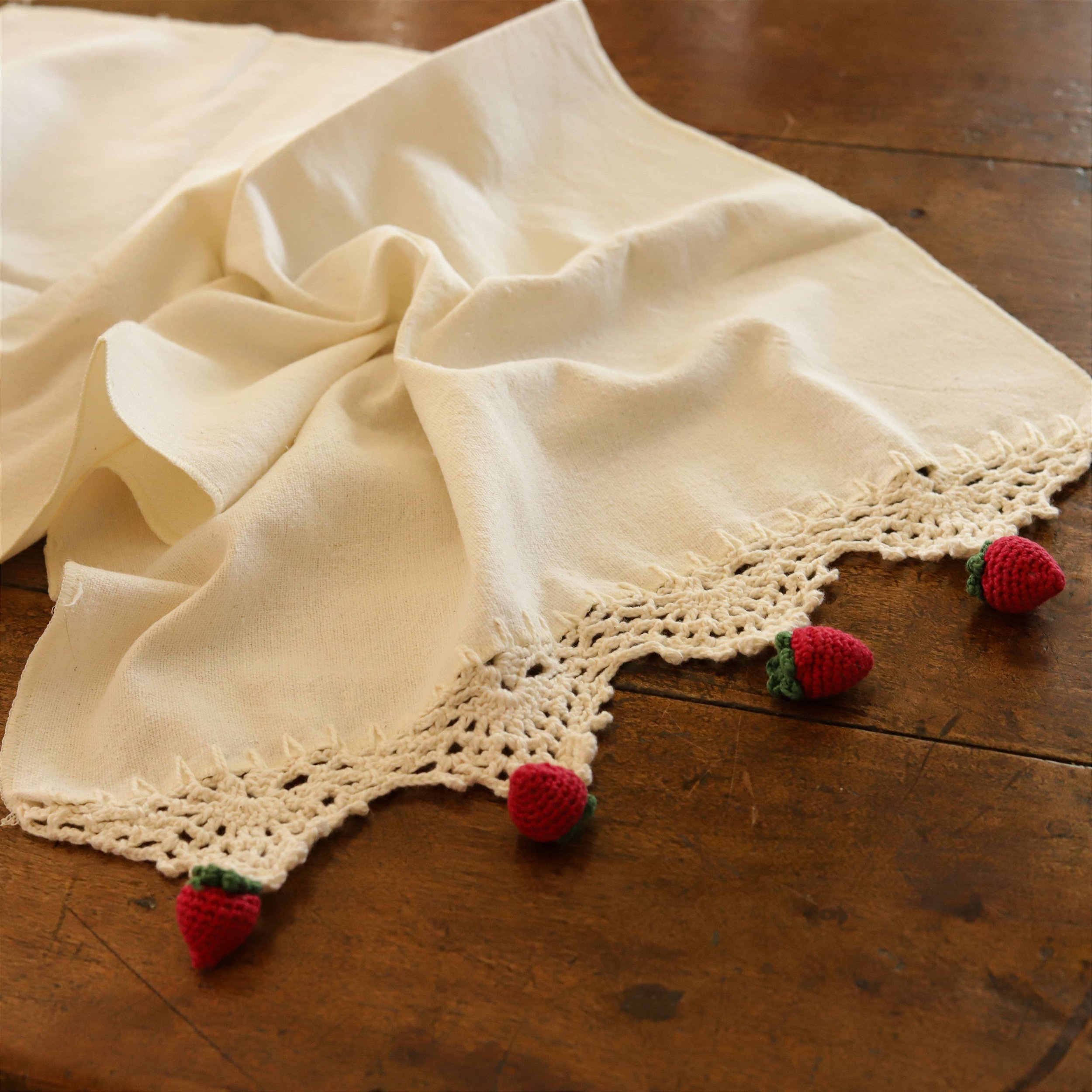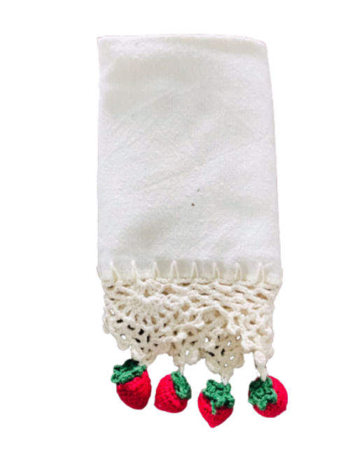 Os ornamentos em forma de morangos, também artesanais, tornam o pano único e divertido, ideal para quem gosta de adicionar personalidade ao ambiente ou criar uma decoração mais artística na cozinha.