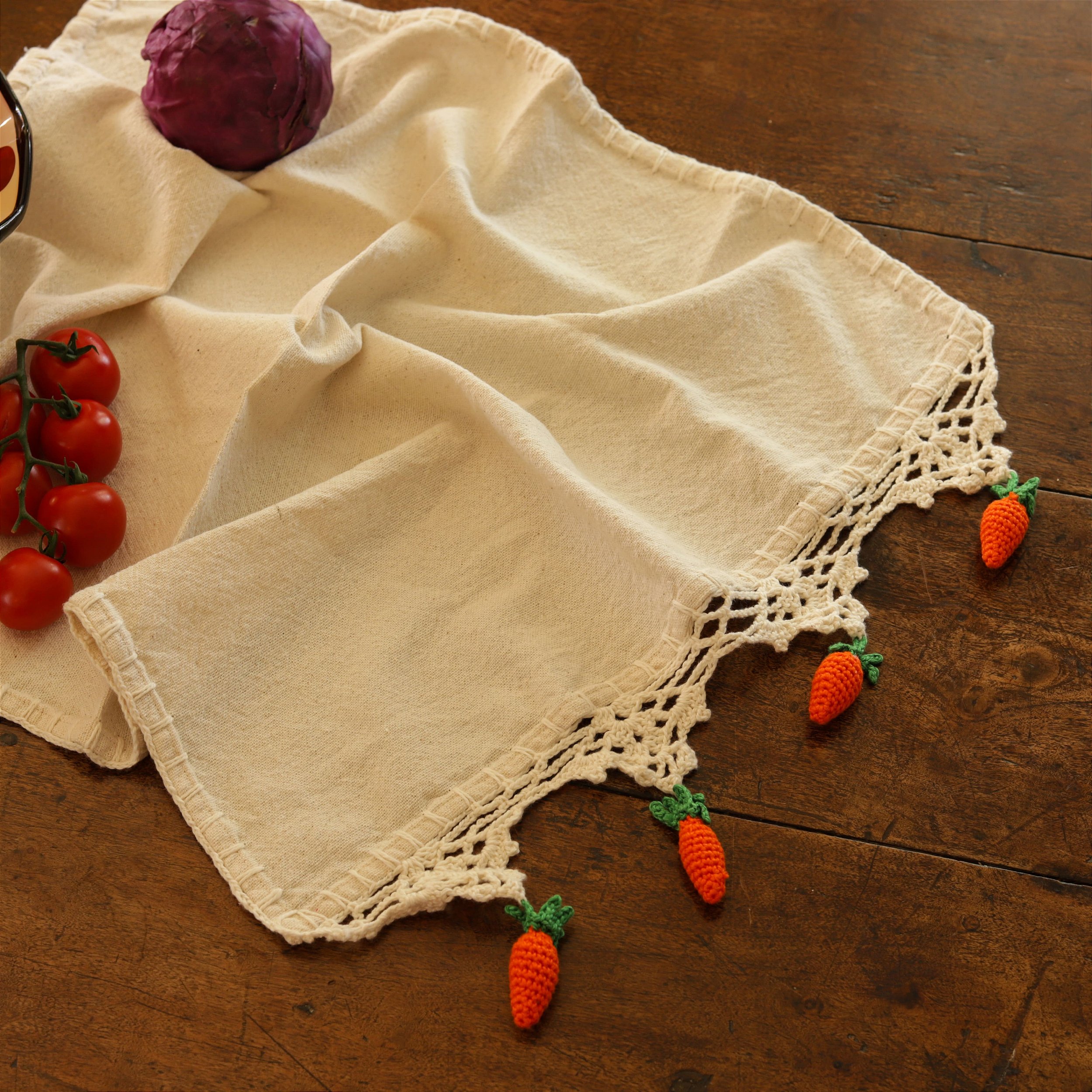 Os ornamentos em forma de cenouras, também artesanais, tornam o pano único e divertido, ideal para quem gosta de adicionar personalidade ao ambiente ou criar uma decoração mais artística na cozinha.